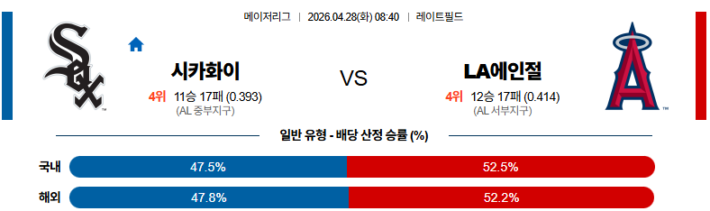 04월28일 시카고W : LA에인절스 MLB 분석 및 예측 스포츠중계,스포츠분석