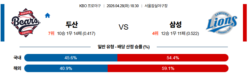04월28일 두산 : 삼성 KBO 분석 및 예측 스포츠중계,스포츠분석