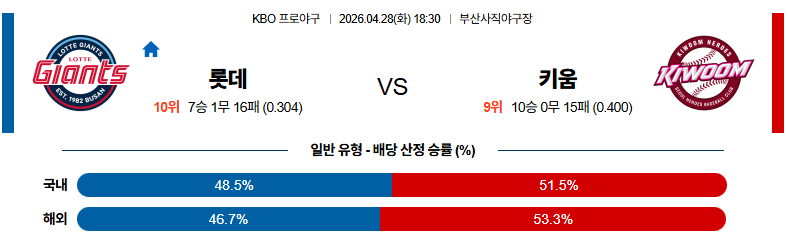 04월28일 롯데 : 키움 KBO 분석 및 예측 스포츠중계,스포츠분석