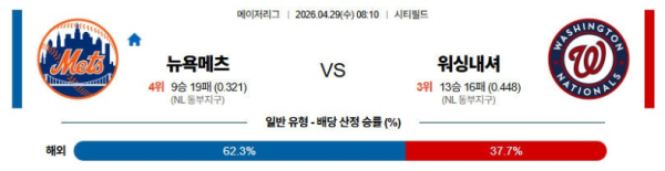 승1패 : 뉴욕 메츠 승리 핸디 : 워싱턴 승리 언더오버: 언더