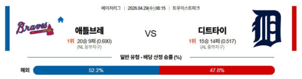 04월29일 애틀랜타 : 디트로이트 MLB 분석 및 예측 스포츠중계,스포츠분석