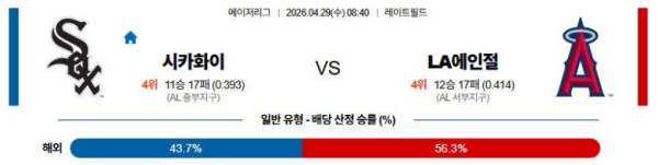 04월29일 시카고W : LA에인절스 MLB 분석 및 예측 스포츠중계,스포츠분석