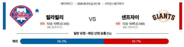 05월01일 필라델피아 : 샌프란시스코 MLB 분석 및 예측 스포츠중계,스포츠분석
