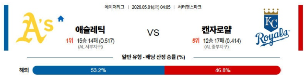 05월01일 애슬레틱스 : 캔자스시티 MLB 분석 및 예측 스포츠중계,스포츠분석