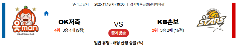 11월18일 OK저축은행:KB손해보험 V리그 분석 및 예측 스포츠중계:스포츠무료중계