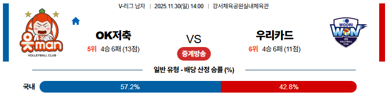 11월30일 OK저축은행:우리카드 V리그 분석 및 예측 스포츠중계:스포츠무료중계