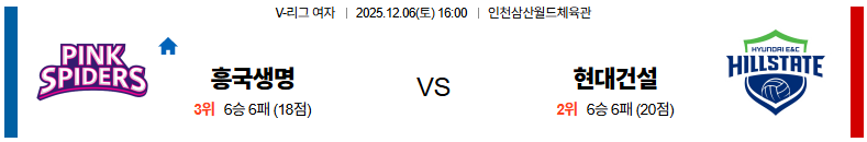 흥국생명 대 현대건설 V리그(여) 12월06일 맞대결 생중계, 스포츠중계, 스포츠분석