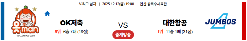 OK저축은행 대 대한항공 V리그 12월12일 맞대결 생중계, 스포츠중계, 스포츠분석