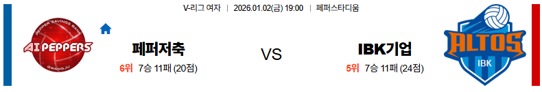 01월02일 페퍼저축은행:IBK기업은행 V리그(여) 분석 및 예측 스포츠중계:스포츠무료중계