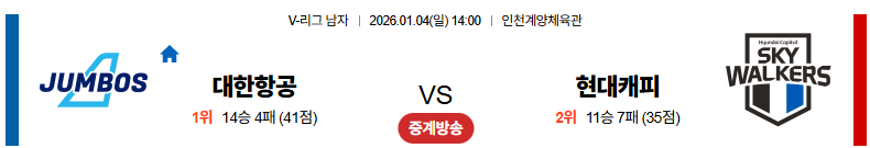 01월04일 대한항공:현대캐피탈 V리그 분석 및 예측 스포츠중계:스포츠무료중계