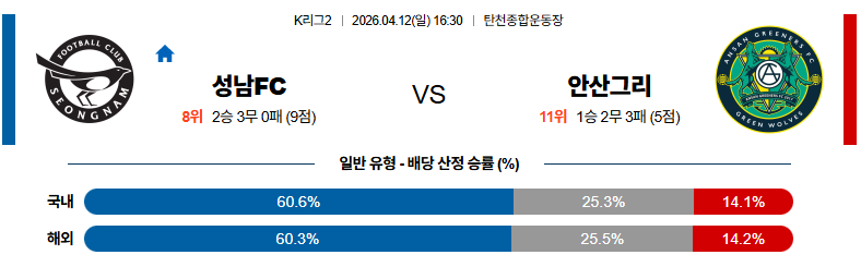 04월12일 성남:안산 K리그2 분석 및 예측 스포츠중계:스포츠무료중계