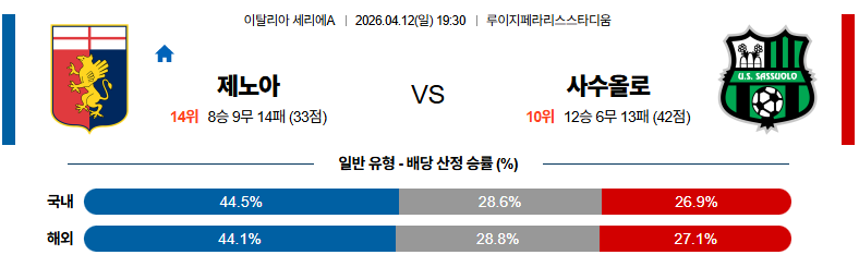 04월12일 제노아:사수올로 세리에A 분석 및 예측 스포츠중계:스포츠무료중계