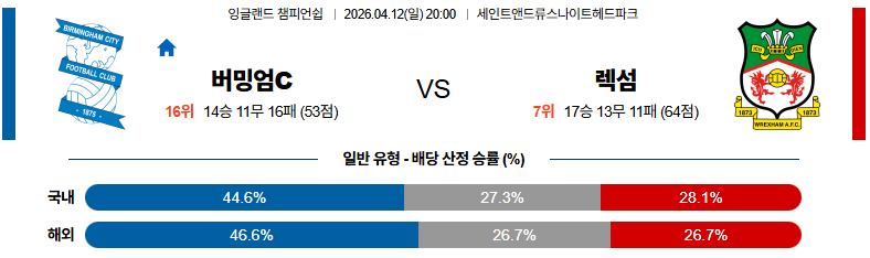 04월12일 버밍엄시티:렉섬 잉글랜드챔피언쉽 분석 및 예측 스포츠중계:스포츠무료중계