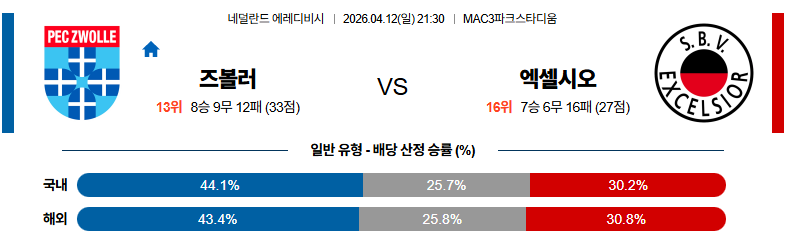 04월12일 엑셀시오르:즈볼레 에레디비지 분석 및 예측 스포츠중계:스포츠무료중계