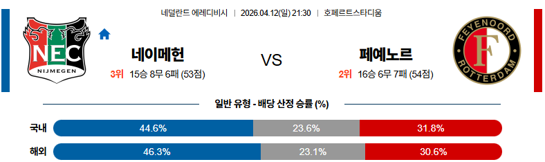 04월12일 폐예노르트:네이메헌 에레디비지 분석 및 예측 스포츠중계:스포츠무료중계