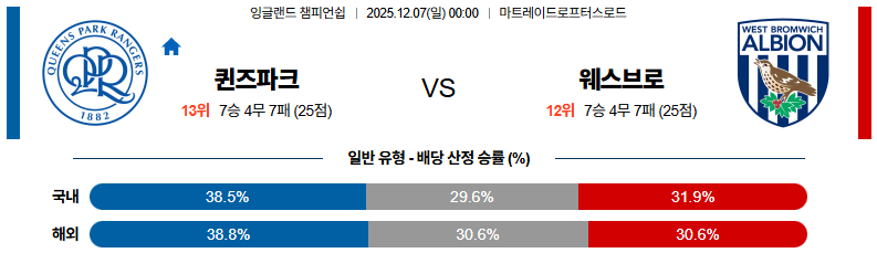 QPR 대 웨스트브로미치 잉글랜드챔피언쉽 12월07일 맞대결 생중계, 스포츠중계, 스포츠분석