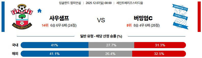 사우샘프턴 대 버밍엄시티 잉글랜드챔피언쉽 12월07일 맞대결 생중계, 스포츠중계, 스포츠분석