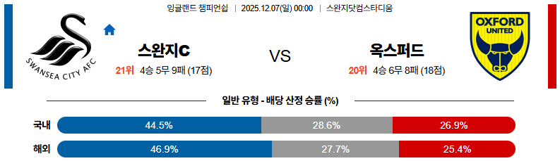 스완지시티 대 옥스퍼드 잉글랜드챔피언쉽 12월07일 맞대결 생중계, 스포츠중계, 스포츠분석