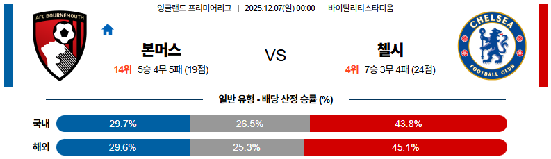 본머스 대 첼시 프리미어리그 12월07일 맞대결 생중계, 스포츠중계, 스포츠분석