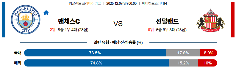 맨체스터 시티는 공이 있는 지점마다 자신들의 숫자를 채워 넣으며, 압박을 무력화하고 점유율로 상대를 지치게 만드는 전형적인 현대축구 운영을 보여줄 가능성이 큽니다. 반면 선더랜드는 끝까지 뛰고 싸우는 정신력으로 버텨야 하지만, 공을 거의 소유하지 못한 채 압박과 수비에 에너지를 쏟는 시간이 길어질수록 실점 가능성은 자연스럽게 높아질 수밖에 없습니다.