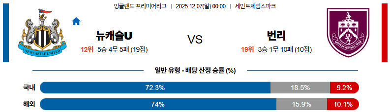 뉴캐슬은 토날리를 중심으로 한 템포 조절과 세트피스 패턴, 그리고 엘랑가와 반스를 활용한 측면 돌파로 홈에서 충분히 다득점을 노릴 수 있는 경기입니다. 반면, 번리는 높은 실점률과 포백 간격 문제, 세트피스 수비 불안으로 뉴캐슬의 공격을 막아내기에는 큰 부담이 있습니다. 전체적인 전력과 전술 완성도, 최근 실점 흐름을 고려할 때 이번 승부는 뉴캐슬 승리 쪽으로 접근하는 것이 합리적입니다.