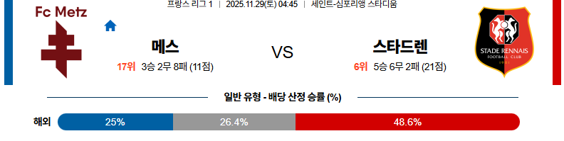 11월29일 메스:스타드렌 리그앙 분석 및 예측 스포츠중계:스포츠무료중계