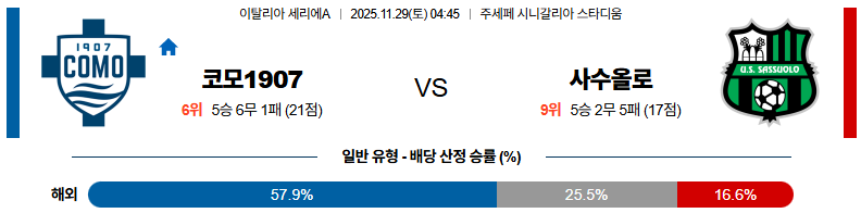 11월29일 코모:사수올로 세리에A 분석 및 예측 스포츠중계:스포츠무료중계