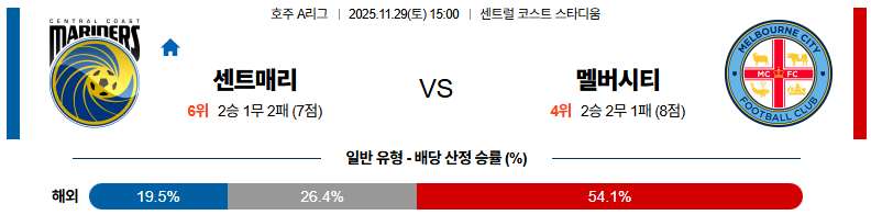 11월29일 센트럴코스트:멜버른시티 호주A리그 분석 및 예측 스포츠중계:스포츠무료중계