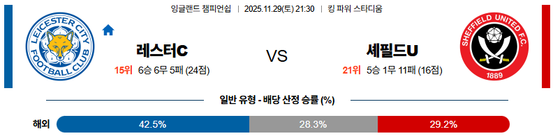 11월29일 레스터시티:셰필드유나이티드 잉글랜드챔피언쉽 분석 및 예측 스포츠중계:스포츠무료중계