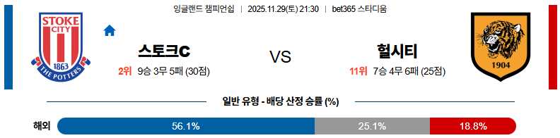 11월29일 스토크시티:헐시티 잉글랜드챔피언쉽 분석 및 예측 스포츠중계:스포츠무료중계