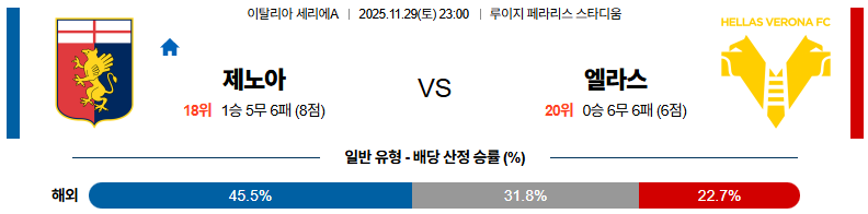 11월29일 제노아:엘라스베로나 세리에A 분석 및 예측 스포츠중계:스포츠무료중계