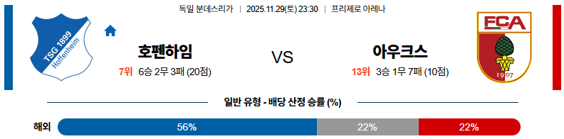 11월29일 호펜하임:아우크스부르크 분데스리가 분석 및 예측 스포츠중계:스포츠무료중계