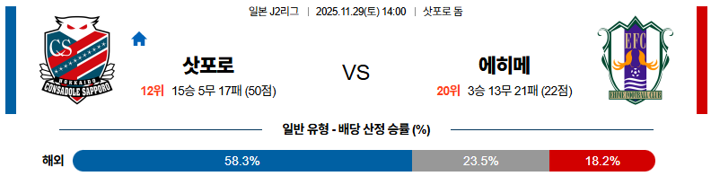 11월29일 에히메:삿포로 J리그2 분석 및 예측 스포츠중계:스포츠무료중계