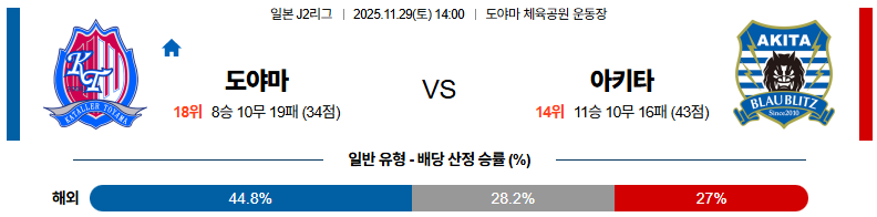 11월29일 도야마:아키타 J리그2 분석 및 예측 스포츠중계:스포츠무료중계