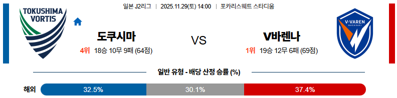 11월29일 도쿠시마:나가사키 J리그2 분석 및 예측 스포츠중계:스포츠무료중계