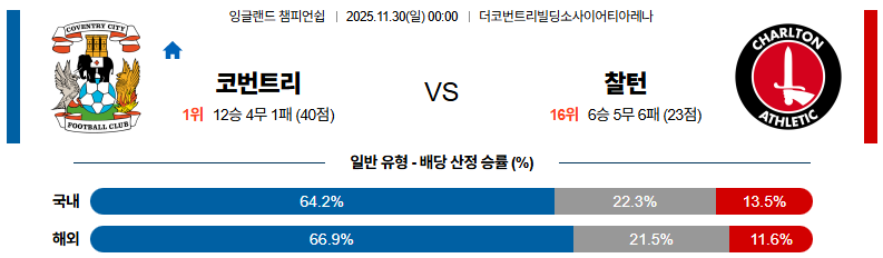 11월30일 코번트리:찰튼 잉글랜드챔피언쉽 분석 및 예측 스포츠중계:스포츠무료중계