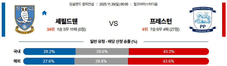 11월30일 셰필드웬즈데이:프레스턴 잉글랜드챔피언쉽 분석 및 예측 스포츠중계:스포츠무료중계