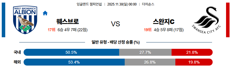 11월30일 웨스트브로미치:스완지시티 잉글랜드챔피언쉽 분석 및 예측 스포츠중계:스포츠무료중계