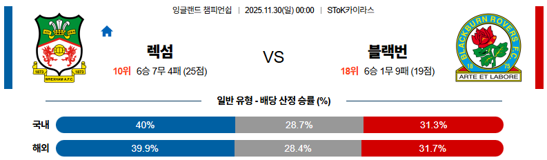 11월30일 렉섬:블랙번 잉글랜드챔피언쉽 분석 및 예측 스포츠중계:스포츠무료중계
