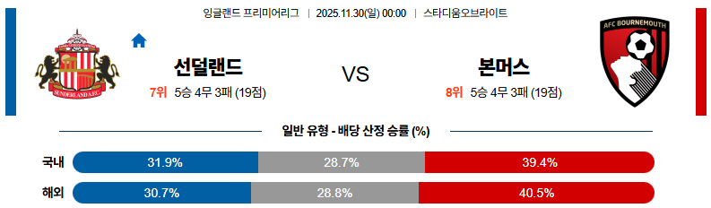 11월30일 선덜랜드:본머스 프리미어리그 분석 및 예측 스포츠중계:스포츠무료중계