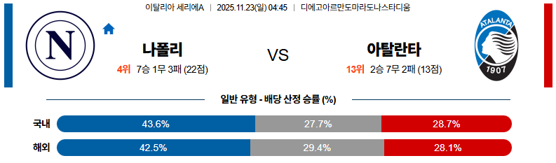 11월23일 나폴리:아탈란타 세리에A 분석 및 예측 스포츠중계:스포츠무료중계