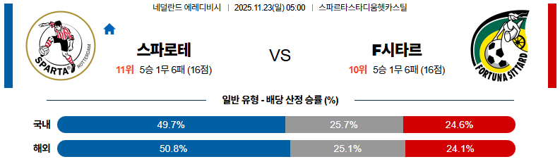 현재 11월23일 스파르타:F시타르 에레디비지 분석 및 예측 스포츠중계:스포츠무료중계