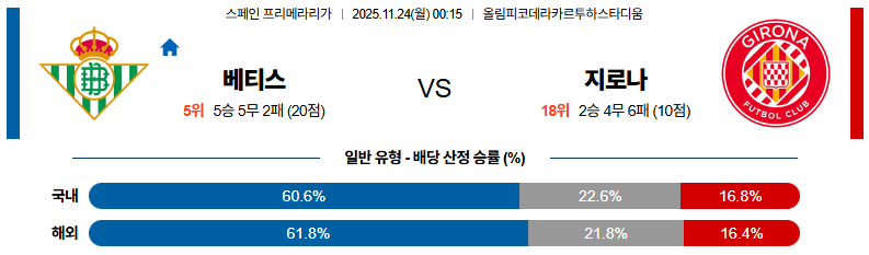 현재 11월24일 베티스:지로나 라리가 분석 및 예측 스포츠중계:스포츠무료중계