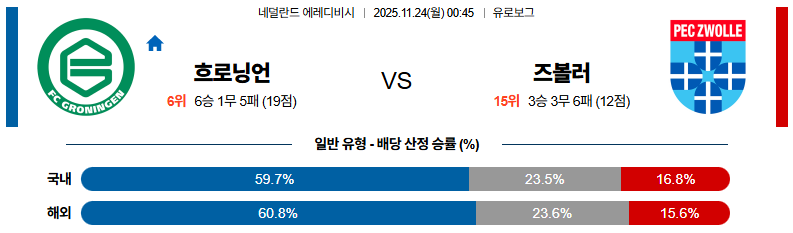 11월24일 흐로닝언:즈볼레 에레디비지 분석 및 예측 스포츠중계:스포츠무료중계
