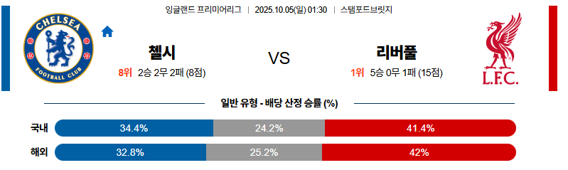 이번 경기는 체력적 격차와 홈 어드밴티지가 결정적인 영향을 미칠 가능성이 큽니다. 첼시는 홈에서 챔피언스리그를 치르며 이동 피로 없이 정상 컨디션을 유지했기 때문에 전방 압박과 빠른 빌드업이 그대로 유지될 전망입니다. 반면 리버풀은 장거리 비행을 동반한 튀르키예 원정을 다녀온 뒤 충분한 회복 시간을 확보하지 못했습니다. 이로 인해 살라와 소보슬러이 등 핵심 자원의 폭발력이 평소만 못할 수 있으며, 후반으로 갈수록 수비 간격이 벌어질 가능성이 높습니다. 결국 홈에서 에너지를 온전히 유지한 첼시가 전방 압박과 중원 장악을 통해 리버풀을 무너뜨릴 것으로 예상됩니다.