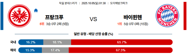 바이에른 뮌헨은 케인을 중심으로 한 공격 라인과 고레츠카가 지배하는 중원을 통해 경기 전체를 통제할 준비가 되어 있습니다. 프랑크푸르트는 홈에서 저항하려 하겠지만, 빌드업의 불안정성과 수비 전환 속도의 한계로 초반부터 주도권을 내줄 가능성이 큽니다. 결국 전력 차가 뚜렷한 이 매치업에서 바이에른 뮌헨의 승리가 가장 합리적이고 안정적인 선택입니다.