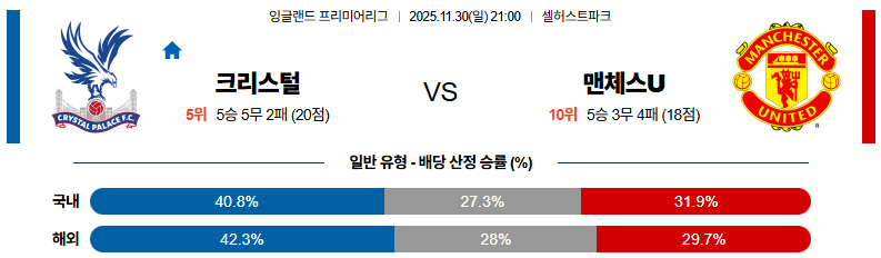 11월30일 크리스탈팰리스:맨체스터유나이티드 프리미어리그 분석 및 예측 스포츠중계:스포츠무료중계