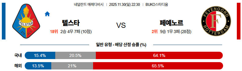 11월30일 텔스타:페예노르트 에레디비지 분석 및 예측 스포츠중계:스포츠무료중계