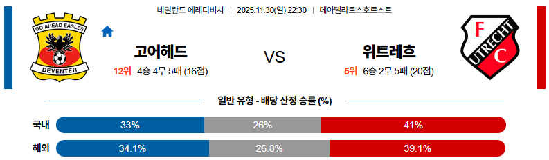 현재 11월30일 고어헤드이글스:위트레흐트 에레디비지 분석 및 예측 스포츠중계:스포츠무료중계
