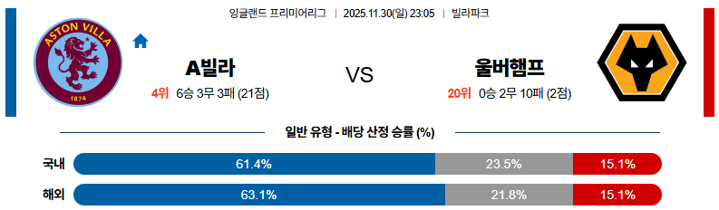 11월30일 아스톤빌라:울버햄튼 프리미어리그 분석 및 예측 스포츠중계:스포츠무료중계
